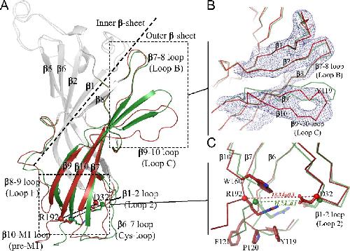 Fig. 2. Tertiary reorganization observed in an ECD monomer. (A) The structural elements that differ between the pH 4 and pH 7 ECD GLIC structures are shown in green for pH 4 and in red for pH 7 GLIC. Other parts of the structures are in gray. Residues Asp32 and Arg192 are shown as sticks. The dashed line delineates the inner and outer β sheets. (B) Enlarged view of the orthosteric agonist binding site illustrating the detachment of loop C from loop B. The blue mesh is the 2mFoâDFc NCS-averaged electron density map contoured at a level of 1.5 Ï. (C) The interface between the ECD and the TMD at the level of the β1âβ2, β6âβ7, and β10âM1 loops. The dashed line indicates the distance between the Cα atoms of Asp32 and Arg192.