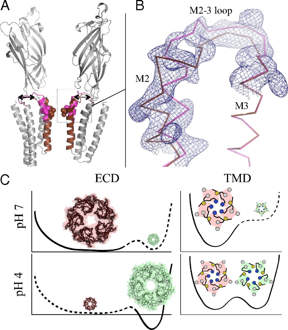 Fig. 3. GLIC open and LC forms coexist at pH 4. (A) Ribbon representation of the GLIC receptor showing the equilibrium of the M2 helices and M2–M3 loops corresponding to the coexisting LC (brown) and open (magenta) conformations in GLICHis10 structure. The rest of the structure is colored in gray. The receptor is viewed from the side, and the two front subunits are removed for clarity. (B) Enlarged view showing the 2mFo–DFc electron density map surrounding the M2 helix and the M2–M3 loop contoured at a level of 1 σ (blue mesh). (C) Energy landscape inferred from the pH 7 crystal form (Upper, pink) and the pH 4 form (Lower, green) described here, for each domain (TMD and ECD).