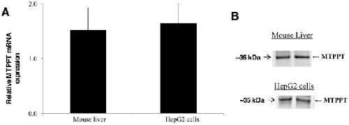 Figure 2. Expression of MTPPT in the mouse liver and HepG2 cells at the mRNA and protein levels.A) Total RNA was isolated and quantitative real-time PCR was performed as described in âMethodsâ. Data (mean ± SE) presented are from four independent mice normalized relative to ARPO or multiple samples from HepG2 cells were normalized relative to β-actin. B) Western blot analysis was performed with the use of isolated mouse liver or HepG2 cells mitochondria (100 µg) and specific anti-MTPPT polyclonal antibodies as described in âMethodsâ. Data from a representative experiment involving two separate mitochondria preparations from two mice or HepG2 cells are shown.