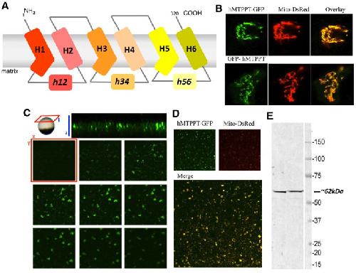 Figure 3. Cellular distribution of hMTPPT-GFP or GFP-hMTPPT in HepG2 cells and X. Oocytes.A) Predicted 6 transmembrane domains of hMTPPT showing the location of three-fold tandem repeated domains and both NH2 and COOH-terminals oriented towards the cytosol. B) Lateral (xy) confocal images of hMTPPT-GFP or GFP-hMTPPT co-transfected with DsRed-Mito (mitochondrial marker) and their overlay in HepG2 cells. C) Resolution of hMTPPT-GFP expression in a Xenopus oocyte. Top, axial image (‘xz’, blue) of a cortical band of hMTPPT-GFP expression. Individual lateral (‘xy’, red) images are displayed as image planes taken at successive 1 µm intervals into the oocyte cortex. D) Lateral (xy) confocal images of hMTPPT-GFP co-transfected with DsRed-Mito and their overlay in Xenopus oocyte. E) Western blot was performed on two individual hMTPPT-GFP expressing oocytes and probed with mouse anti-GFP (1∶1000) and goat anti-mouse antibodies (1∶5000).