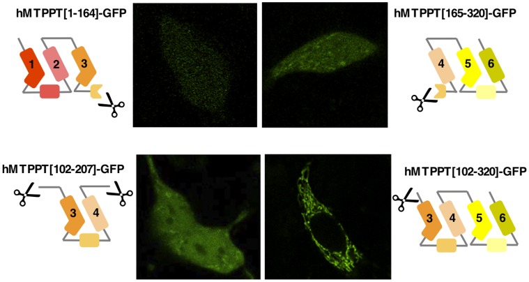 Figure 4. Systematic truncation of the hMTPPT polypeptide and their expression pattern in HepG2 cells.Sub cellular expression of indicated (five) hMTPPT-GFP truncated constructs in HepG2 cells. Lateral (xy) confocal images of different truncated constructs were imaged after 24–48 hrs of transient transfection.