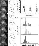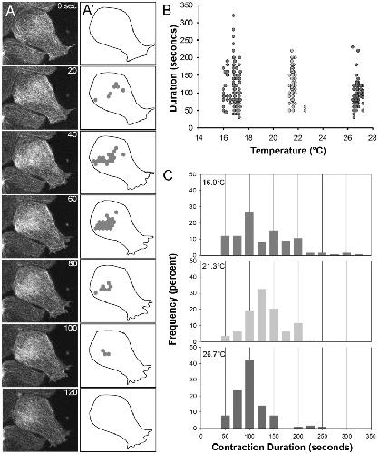 Figure 4. Duration of actomyosin contractions depends on temperature.(A) Sequential frames from a representative time-lapse sequence collected from the basal cortex of an animal cap ectoderm explant cultured on fibronectin-coated glass substrate. F-actin dynamics are revealed in cells expressing the actin-binding domain from moesin coupled to EGFP (moe-GFP) (left column). This sample collected at 16°C. (A′) Schematic of frames matching those in (A) highlighting the cell outline (dotted line) and hexagonal regions of the cell cortex identified as “F-actin contractions.” Regions are categorized as contractions when their integrated intensities are 50% greater than the mean intensity of the basal cell cortex. (B) Duration of individual F-actin contractions across the three temperature regimes. (C) Frequency distribution of the duration F-actin contractions at three temperatures. Note abundant short duration contractions at the low temperature regime. |
