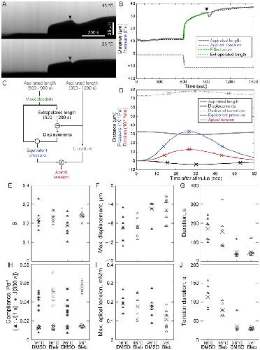 Figure 1. Temperature dependence of compliance and strength of induced contraction.(A) Representative kymographs of microaspiration with electrically induced contractions at 900 seconds at 16°C (upper) and 26°C (lower). (B) Fit of power law viscoelastic model to the aspirated length from 600 to 900 s for the 26°C case. (C) Flow chart for analysis of contractions. (D) Contraction analysis. âX's indicate half-max, max, and return to half-max for each curve. Panels B and D show data from the lower embryo in A. Arrowheads in A and B indicate electrical stimuli. (E) β, (F) maximum displacement during induced contraction, (G) duration (half-maximum until return to half-maximum displacement) of contraction, (H) compliance at 1 s (triangles) and at 300 s (circles), (I) maximum apical tension during induced contraction, (J) duration of apical tension. Triangles and circles: individual embryos; X's: means. |