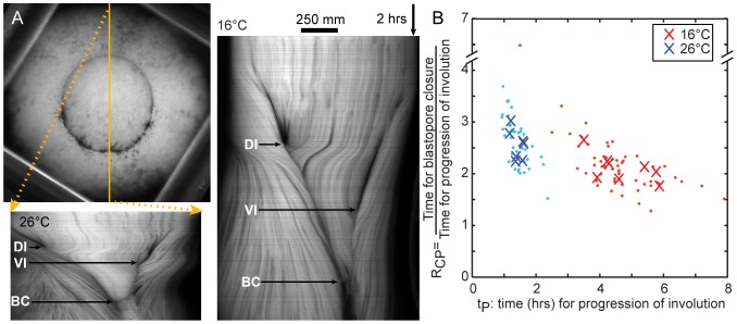 Figure 2. Blastopore closure at high and low temperatures.(A) Upper: vegetal view of an embryo showing the blastopore soon after the start of dorsal superficial involution. Lower left: kymograph of blastopore closure at 26°C, taken along the yellow line from the dorsal side to the ventral side, showing the points when dorsal (DI) and ventral (VI) superficial involution begin, and when the blastopore closes (BC). Right: kymograph taken along a line from the dorsal to the ventral side at 16°C. (B) The ratio (RCP) of the time for blastopore closure to the time for dorsal-to-ventral progression of involution versus the time (tP) for dorsal-to-ventral progression of involution. Dots indicate individual embryos. X's indicate medians for clutches (4 to 8 embryos each). |