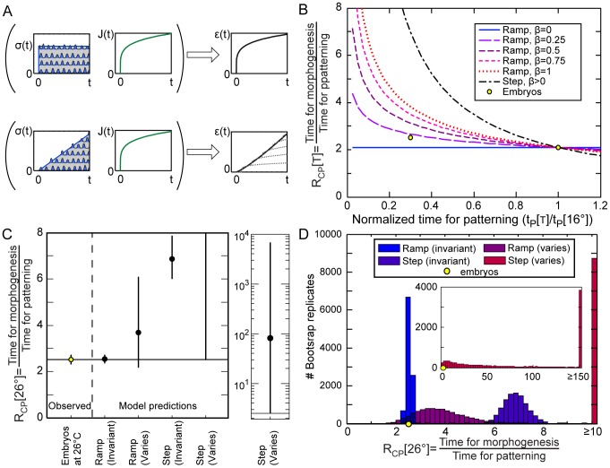 Figure 3. Comparison of viscoelastic models of morphogenesis for ramped versus stepped forces.(A) Diagram of model. Summed contractions (wavy lines) average out to stepped or ramped stresses (σ) depending on when cells begin contracting. When applied to the viscoelastic material with compliance J[t], the deformations (strains, ε) follow the time course of ramped forces more closely than stepped force. This can be visualized as adding up strains due to a series of stepped forces applied over time (dotted lines on right). (B) Predictions for RCP, the ratio of the time for morphogenesis (blastopore closure) to the time for patterning (D-V progression of involution), as a function of the time for patterning at temperature T, normalized to the time for patterning at 16°C, for ramped vs. stepped models for different values of β. Yellow dots: grand mean of experimentally observed values. The curves automatically converge to the right hand dot (at 16°C) where T2 = T1 since tC at T1 is used to calculate RCP at T2. (C) Comparison of the observed RCP at 26°C to the predictions for models with ramped or stepped forces, and with temperature invariant or varying mechanical properties (inset: prediction for stepped force model with temperature dependent mechanical properties on a log scale.) Error bars indicate confidence intervals. (D) Histogram of bootstrap resampling estimates of RCP at 26°C for each model (10,000 resamples total). |