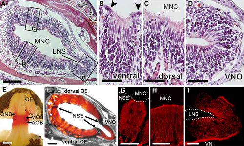 We analyzed the expression of G protein α subunits and the axonal projection into the brain in the olfactory system of the semiaquatic newt Cynops pyrrhogaster by immunostaining with antibodies against Gαolf and Gαo , by in situ hybridization using probes for Gαolf , Gαo , and Gαi2 , and by neuronal tracing with DiI and DiA. The main olfactory epithelium (OE) consists of two parts, the ventral OE and dorsal OE. In the ventral OE, the Gαolf - and Gαo -expressing neurons are located in the apical and basal zone of the OE, respectively. This zonal expression was similar to that of the OE in the middle cavity of the fully aquatic toad Xenopus laevis. However, the Gαolf - and Gαo -expressing neurons in the newt ventral OE project their axons toward the main olfactory bulb (MOB) and the accessory olfactory bulb (AOB), respectively, whereas in Xenopus, the axons of both neurons project solely toward the MOB. In the dorsal OE of the newt, as in the principal cavity of Xenopus, the majority of the neurons express Gαolf and extend their axons into the MOB. In the vomeronasal organ (VNO), the neurons mostly express Gαo . These neurons and quite a few Gαolf -expressing neurons project their axons toward the AOB. This feature is similar to that in the terrestrial toad Bufo japonicus and is different from that in Xenopus, in which VNO neurons express solely Gαo , although their axons invariably project toward the AOB. We discuss the findings in the light of diversification and evolution of the vertebrate olfactory system.