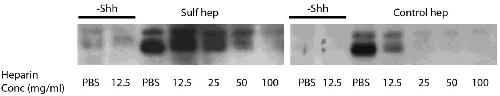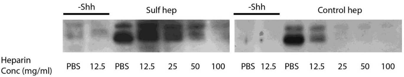 Shh was expressed in Xenopus embryos and then bound to heparin agarose beads. Shh was competed off the agarose beads either with heparin (at 12.5, 25, 50, or 100 mg/ml) or Sulf treated heparin at the same concentrations. Shh protein that remained bound to the heparin agarose beads was analysed by Western blotting with an anti-body against Shh. This heparin competition assay shows that Sulf treated heparin is less effective at competing for Shh immobilised on heparin agarose and likely has less affinity for Shh then fully sulphated heparin.