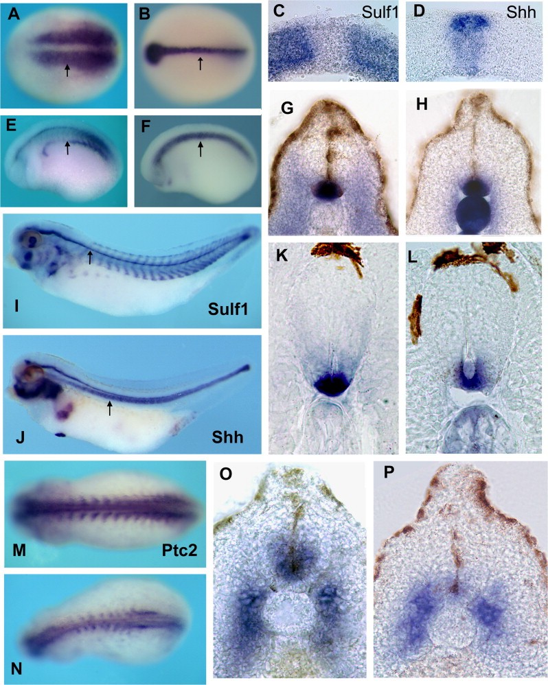 Fig. 1. Sulf1 is co-expressed with Shh in the floor plate of the neural tube in Xenopus tropicalis and is required for normal Shh signalling. in situ hybridisation shows the normal expression pattern of Sulf1 (A,C,E, G, I, K) and Shh (B, D, F, H, J, L) at stages 15 (AâD) 23 (EâH), and 35 (IâL). Arrows in (A, B, E, F, I, J) indicate level where the vibratome sections were taken at these same stages and are shown in (C, D, G, H, K, L). Sulf1 is expressed in the paraxial mesoderm at Stage 15 (A, C) while Shh is expressed in the floor plate and notochord (B, D). By stage 23, both Sulf1 and Shh are expressed in the floor plate (EâH), and this co-expression is still apparent at stage 35 (IâL). Knockdown of Sulf1 using a splice blocking morpholino oligo shows a reduced level of ptc expression in the neural tube (N, P) as compared to those injected with an equal amount of a control morpholino (M, O). |