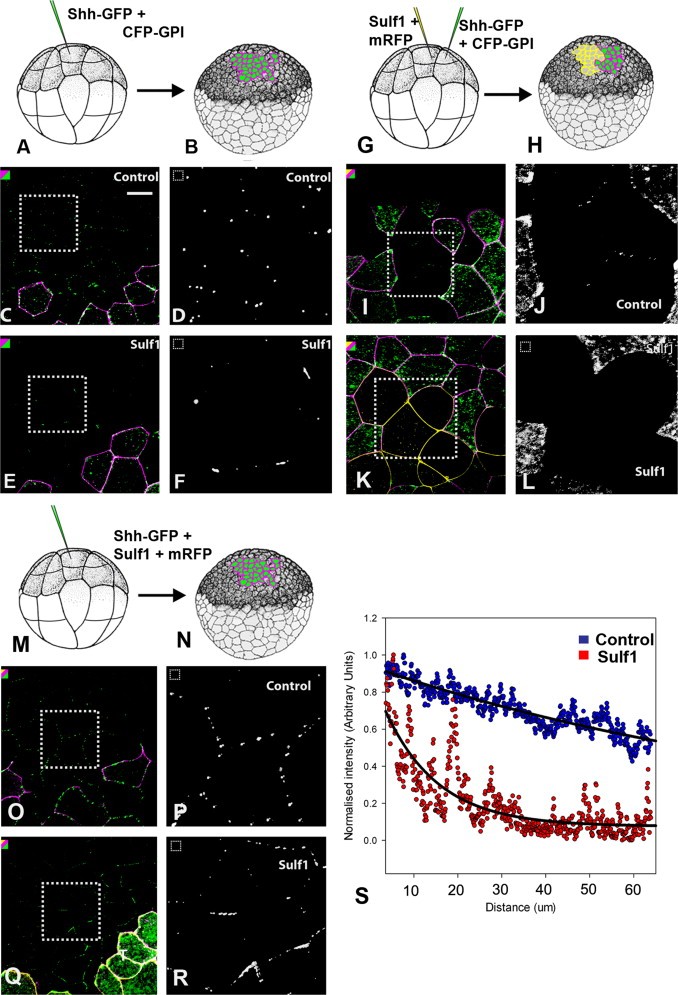 Fig. 4. Sulf1 affects the diffusion of Shh-GFP in embryo explants. Shh-GFP is shown as green, and is co-expressed with the membrane tethered lineage marker, CFP-GPI which is shown as magenta. Sulf1 mRNA was co-injected with membrane RFP, which is shown in yellow. The cartoons in Fig. 4 illustrate the experiments done in the panels below. (AâD) Shh-GFP expressed in a subset of cells labelled with CFP-GPI (magenta) is able to diffuse away from its site of synthesis forming discrete puncta around cells at a distance from its source. (EâF) When Sulf1 is expressed globally, Shh-GFP is less able to diffuse away from its source. When Sulf1 (yellow) is expressed in cells adjacent to a source of Shh-GFP (magenta) (GâJ), diffusion of Shh-GFP is completely abolished within the Sulf1 expressing region (K, L). Shh-GFP displays a reduction in its diffusion when it is co-expressed with Sulf1 (MâR). 50âM squares are shown at a 10 fold magnification in adjacent panels (D, F, J, L, P, R) revealing that while Shh-GFP forms discrete puncta in controls (D, P), large aggregates of Shh-GFP form when Sulf1 is expressed either globally (F) or co-expressed with Shh-GFP (R). Magnified images show only Shh-GFP which is depicted in white to improve contrast. (S) Fluorescence levels were quantified using the plot profile function in ImageJ and fluorescent intensity is shown as a function of the distance from the source cells in embryos co-injected with Shh-GFP and control mRNA (blue) versus embryos co-expressing both Shh-GFP and Sulf1 (red). Scale bar is 20 μM. |