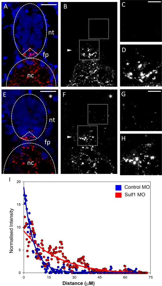 Fig. 5. Sulf1 is required for the normal distribution of Shh protein in vivo. (AâD) Immunostaining embryos unilaterally injected with a control morpholino with 5E1reveals Shh protein in the notochord (NC) and the neural tube (NT), with highest levels in the floor plate (FP). In these control embryos the level of Shh protein in the neural tube drops off sharply away from the FP and is not detected within the dorsal neural tube (C). (EâH) Unilateral knockdown of Sulf1 in vivo leads to a change in the distribution of Shh protein on the injected side (*) where there is reduced Shh protein detected which is detected much further dorsally in a more diffuse pattern than in controls (compare G with C). (I) Quantification of the immunohistochemistry reveals a marked change in the diffusion of Shh away from its source in the absence of Sulf1 expression. The level of Shh in controls embryos (blue) immediately adjacent to Shh producing cells is high; this drops to almost zero within ~20 μm. In the absence of Sulf1(red), the level of ligand adjacent to producing cells is lower than in controls, but this level remains higher much further from the source, only dropping to zero ~50 μm from the source cells. Graph represents average grey level across the width of the neural tube on the injected side. Area measured for quantification shown. Mean values from a number of samples are shown (CMO n=5, AMO n=7). |