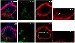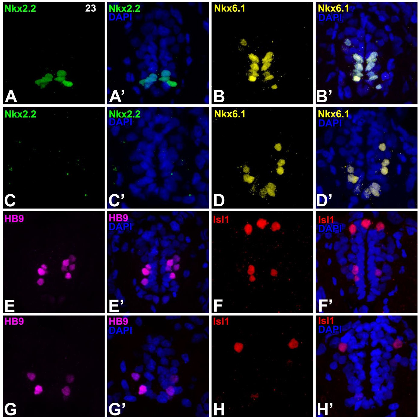 When Shh signalling is blocked using the smoothened inhibitor cyclopamine, the expression of Nkx2.2 is completely lost (n = 20, 100%).The expression of Nkx6.1 is shifted ventrally (n = 14, 93%) in cyclopamine treated embryos, and there are fewer motor neurons progenitors as shown by a loss of HB9+ (n = 15, 93%) and Isl1+(n = 15, 93%) cells in the ventral neural tube. Embryos were mechanically de-membraned at NF stage 9 and cultured in MRS/20 containing 100μM cyclopamine. Embryos were rinsed in series of MRS/20 washes before fixation. Sectioning and immunohistochemistry was carried out as described in the methods. |