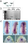Fig. 3. Sulf1 is required for normal proliferation in the neural tube. (A, C) Antibody staining for the mitotic cell marker phosphor-Histone3 (pH3) reveals the normal number of cells in mitosis in the neural tube at NF stage 22 (n=11, range from 2 to 4 pH3 positive cells, average 3, median 3, standard deviation 0.77). (B, D) Antibody staining for pH3 when Sulf1 is knocked-down (n=9, range 0 to 2 cells, average 1, median 1, standard deviation 0.71). (E) Graph of the data where the reduction in pH3 positive cells in embryos lacking Sulf1 compared to controls is significant (Student׳s t-test P<0.0001). |