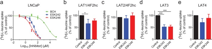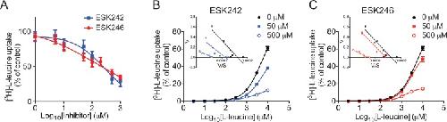 (A) Increasing doses of ESK242 and ESK246 inhibit [3H]-l-leucine transport in oocytes expressing LAT3 with IC50 values of 281.8 ± 1.3 μM and 146.7 ± 2.4 μM,