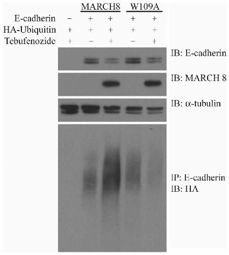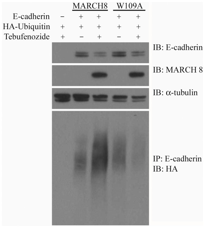 Figure 7. E-cadherin is ubiquitinated by March 8.HEK293T cells were transfected with HA-Ubiquitin, E-cadherin-GFP, and WT or W109A mutant March8, as indicated, and March8 expression was induced with tebufenozide (see Materials and Methods). E-cadherin was immunoprecipitated (IP) from lysates and immunoblotted (IB) with anti-HA antibody to detect ubiquitinated E-cadherin. Expression of the different proteins was checked by IB of lysates. Three additional independent experiments, and quantification of E-cadherin ubiquitination, are shown in Figure S5.