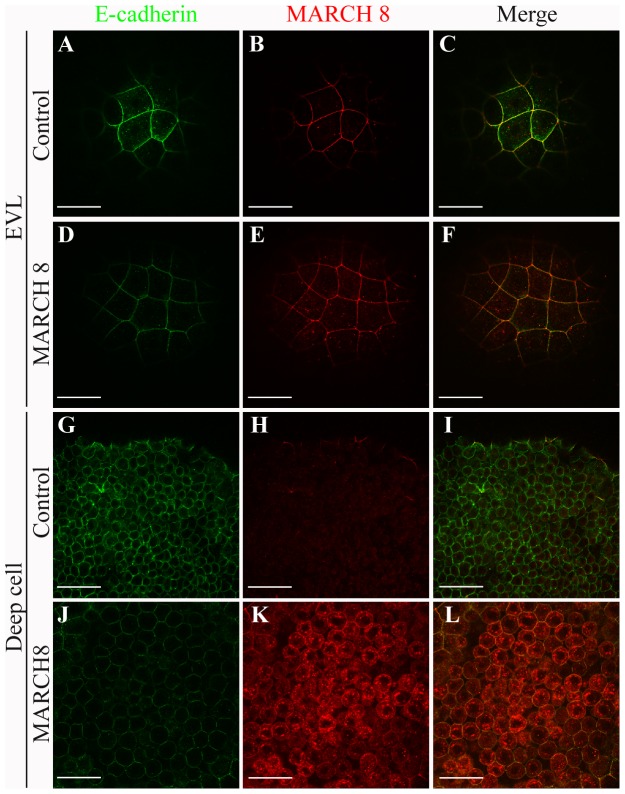 Figure 5. March8 down-regulates cell surface levels of E-cadherin.Control and march8 mRNA (25 pg) injected embryos were fixed at germ ring stage and stained with anti-March8 (red) and anti-E-cadherin (green) antibodies. Confocal images of EVL and deep cells are shown in animal pole view. March8 overexpression is visualized by higher levels of March8 in intracellular vesicles, and leads to reduced cell surface localization of E-cadherin.