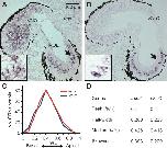 Fig. 2. Distribution of trpc2-positive cells closely mimics that of v2r-C-expressing cells in the MOE. (A) Cryosections of larval Xenopus laevis were hybridized with antisense probes for the trpc2 gene. The micrograph shown is from a horizontal section of larval head tissue, which contains both the MOE and the VNO. A zone of trpc2-positive cells was detected in the MOE and widespread labeling was visible in the VNO. The arrow is pointing at the region enlarged in the inset. (B) Cryosections of larval head tissue were hybridized with antisense probes for the v2r-C gene. Orientation and region as explained in A. Consistent with previous results (see Syed et al., 2013), v2r-C-positive cells were only found in the MOE, and occupy a discrete zone there. The arrow is pointing at the region enlarged in the inset. (C) Basal-to-apical distribution (0, most basal; 1, most apical position) of trpc2 (314 cells, 5 sections) and v2r-C-expressing cells [data taken from Syed et al. (Syed et al., 2013) and shown here for comparison]. Data are given as mid-bin values (0.1 bin size); y-axis shows total number of cells per bin. (D) Characteristic parameters for the distribution of trpc2-expressing cells; values for v2r-C taken from our earlier work (Syed et al., 2013) are shown for comparison.