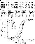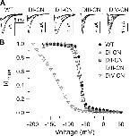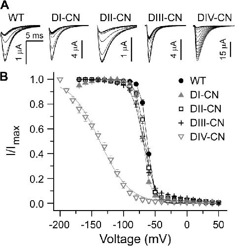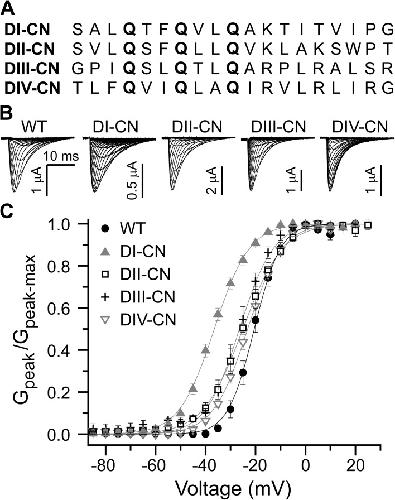 Figure 1. Domain-specific charge neutralizations. (A) Sequence alignments of the S4 voltage-sensing segments from each domain in Nav1.4. Mutations are marked in bold. (B) A representative family of ionic current traces for wild-type and mutant channels in response to 30-ms depolarizing pulses from −110 to 65 mV (10-mV steps), preceded by a 20-ms prepulse to −120 mV from a holding potential of −80 mV. (C) Normalized peak G-V relationship for wild-type and mutant channels. Solid lines are single Boltzmann fits to the mean for each construct (wild type: V1/2 = −23.8 mV and z = 5.8 e−; DI-CN: V1/2 = −36.5 mV and z = 3.8 e−; DII-CN: V1/2 = −25.1 mV and z = 3.3 e−; DIII-CN: V1/2 = −26.4 mV and z = 3.9 e−; DIV-CN: V1/2 = −23.1 mV and z = 3.8 e−).