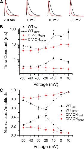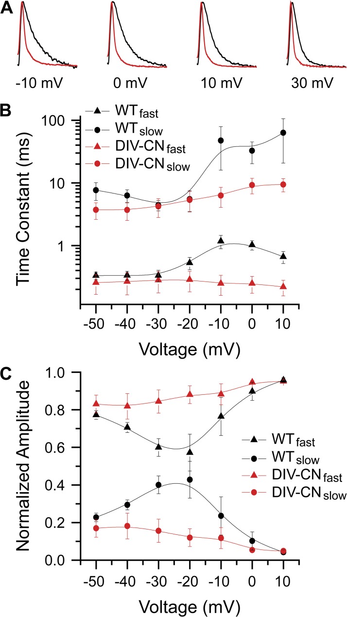 Figure 5. DIV-CN eliminates most of the gating charge movement associated with DIV. (A) Comparison of normalized ON gating currents for wild-type (black) and DIV-CN (red) channels in response to depolarizing voltage steps to −30, −10, and 0 mV after a 50-ms prepulse to −130 mV. Pore currents were blocked with CTX, which we have recently shown does not affect DIV gating charge movement, unlike tetrodotoxin (Capes et al., 2012). (B and C) ON gating currents were fit with a bi-exponential decay. The voltage dependence of the fast and slow time constants and their relative amplitudes for wild-type and DIV-CN channels is summarized in B and C, respectively (mean ± SEM; n ≥ 4).