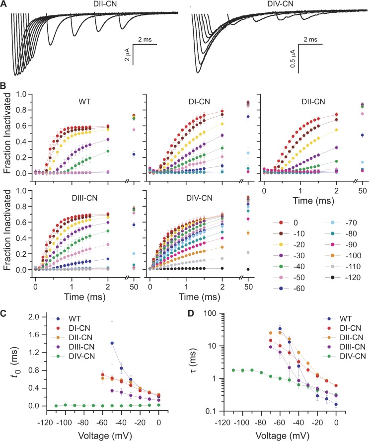 Figure 2. DIV voltage-sensor movement is sufficient for fast inactivation. (A) A representative family of current traces in response to a 30-ms test pulse to −30 mV to assay the fraction of non–steady-state inactivated channels after a 100-ms conditioning prepulse between −170 and 50 mV. See Results for a detailed description of the voltage-pulse protocol. (B) Normalized steady-state inactivation versus conditioning prepulse voltage for wild-type and mutant channels. Solid lines are single Boltzmann fits to the mean for each construct (wild type: V1/2 = −62.3 mV and z = 4.7 e−; DI-CN: V1/2 = −69.2 mV and z = 4.2 e−; DII-CN: V1/2 = −65.8 mV and z = 3.7 e−; DIII-CN: V1/2 = −68.7 mV and z = 2.7 e−; DIV-CN: V1/2 = −137.3 mV and z = 1.1 e−). Note that the relation does not saturate above −200 mV for DIV-CN, so the observed left-shift in the steady-state inactivation versus voltage relation reflects the minimum shift conferred by this mutant.