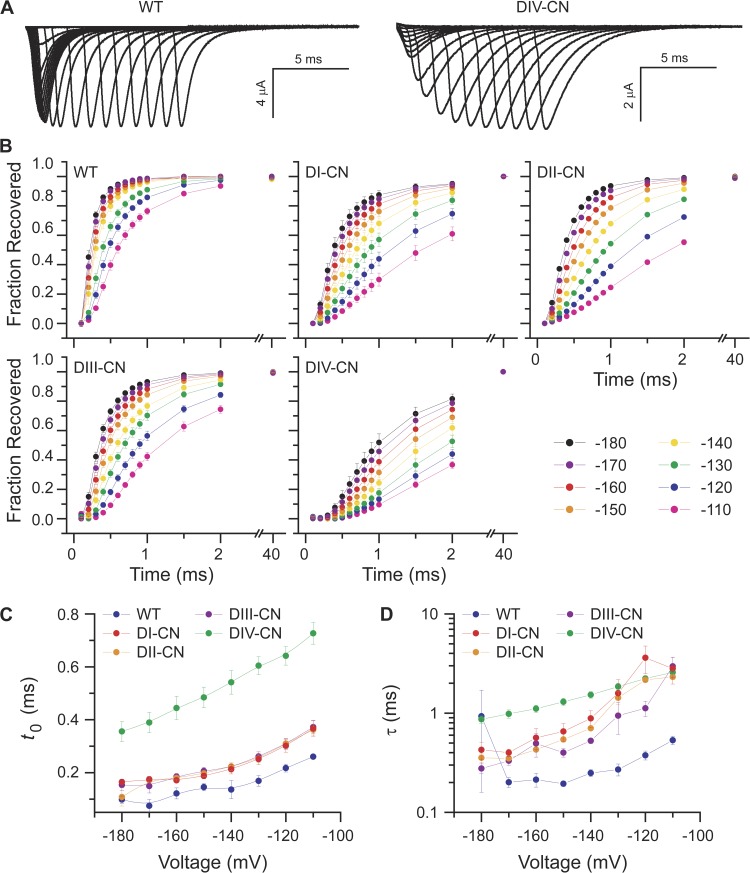 Figure 4. DIV voltage-sensor movement is rate limiting for recovery from fast inactivation. (A) Representative families of traces illustrating current responses to a −20-mV test pulse after recovery from inactivation during a variable duration conditioning pulse at −140 mV after initially inactivating the channels for 30 ms at −20 mV. See Results for a detailed description of the voltage-pulse protocol. (B) Summary of the time course of recovery from fast inactivation for conditioning voltages spanning −180 to −110 mV. (C and D) For each conditioning voltage, the time course of recovery from fast inactivation shown in B was fit to the bi-exponential rise {A1(1−e−(t−t0)/τ1)+A2(1−e−(t−t0)/τ2)}H(t−t0), where t is the duration of the conditioning pulse, Ai and τi are the amplitudes and time constants of the rise (i = 1,2), H is the unit step function, and t0 is the delay after onset of the conditioning pulse to initiation of recovery from fast inactivation. The voltage dependence of the delay and fast time constant for each construct is summarized in C and D, respectively (mean ± SEM).