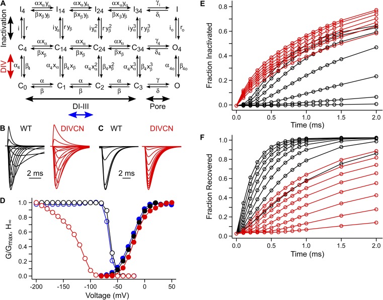 Figure 6. A sodium channel gating model for the distinct role of DIV in fast inactivation. (A) Kinetic model for sodium channel gating. The horizontal transitions from left to right reflect activation of the DI–III voltage sensors followed by pore opening, and the vertical transitions from bottom to top reflect activation of the DIV voltage sensor followed by occlusion of the pore by the fast inactivation motif. Rate constants and associated charges are listed in Table 1. The effects of the DIV-CN mutant were explained solely by reducing the charge and varying the rates associated with movement of the DIV voltage sensor only such that DIV was biased toward its activated conformation (red arrow; see Table 1 for parameter values). The effects of the DI/II/III-CN mutants were qualitatively explained by reducing the charge and varying the rates for only the middle set of transitions associated with movement of the DI–III voltage sensors (blue arrow; see Table 1 for parameter values). (B) Simulated current responses to families of depolarizing voltage steps as described for Fig. 1 B. (C) Simulated current responses to a steady-state inactivation protocol as described for Fig. 2 A. (D) Simulated peak conductance (closed circles) and steady-state inactivation (open circles) as a function of voltage for wild-type (black), DIV-CN (red), and DI/II/III-CN (blue) channels. (E and F) Simulated time courses for development (−60 to 0 mV) and recovery (−180 to −110 mV) from inactivation for wild-type (black) and DIV-CN (red) channels. Note that fraction inactivated/recovered was not computed as the direct probability of being in one of the model’s inactivated states but rather was obtained from simulated current responses as described in Figs. 3 B and 4 B. Simulations for DI/II/III-CN channels were similar to wild type.