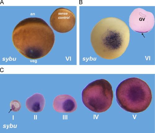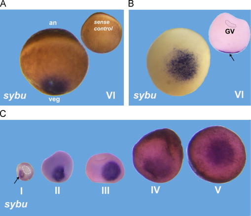 Fig. 2. Xenopus syntabulin is a vegetally localized maternal mRNA. (A) Whole-mount in situ hybridization on stage VI oocytes using an antisense probe showing that maternal syntabulin (sybu) transcripts are localized at the center of the vegetal pole. The inset shows the sense probe negative control. (B) In situ hybridization on albino stage VI oocytes showing that syntabulin transcripts form a granular pattern in the vegetal cortex; note arrow in the hemisection shown in the inset. The germinal vesicle is indicated by a dotted line in inset. (C) In situ hybridization of sybu at different stages of oogenesis (IâV) showing that maternal transcripts localize early (stage I, arrow) in the mitochondrial cloud, and in the cortex of the vegetal pole at later stages. Dotted line in stage I oocyte marks the nucleus. An=animal pole; Veg=vegetal pole; GV=germinal vesicle.