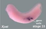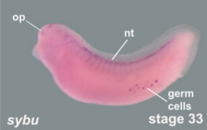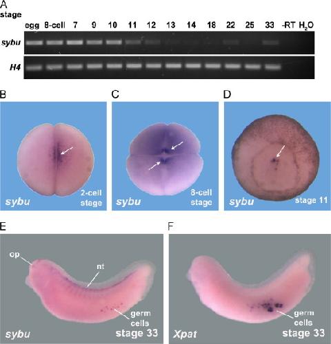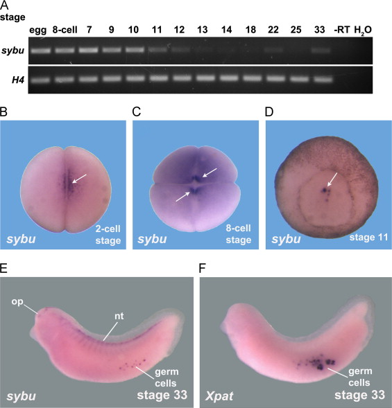 Fig. 3. Maternal syntabulin mRNA is present during early stages of development, and associates with germ plasm and germ cells. (A) Semiquantitative RT-PCR showing syntabulin (sybu) mRNA levels at different developmental stages. Histone 4 (H4) mRNA was used as loading control. (B, C) In the cleaving embryo, syntabulin mRNA associates to germ plasm islands, that occupy a characteristic position close to the cleavage furrow (arrows). (D) During gastrulation, syntabulin transcripts are detected in a small subset of endodermal cells (arrow), corresponding to the known location of germ cell precursors. (E) At stage 33, syntabulin is detected in different tissues such as the olfactory placode (op), the neural tube (nt) and the germ cells. (F) Expression pattern of an established germ cell marker, Xpat, at stage 33. Note the similar localization between syntabulin and Xpat in the germ cell territory.