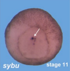 sybu (syntabulin) gene expression in Xenopus laevis embryo, NF stage 4 (8-cell), as assayed by in situ hybridization, vegetal view.