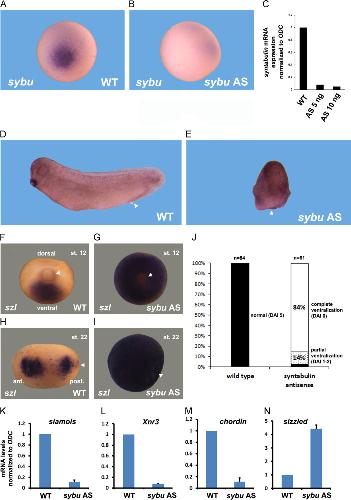 Fig. 4. Depletion of maternal syntabulin causes embryo ventralization and decreases the expression of dorsal genes. (A) Wild type oocyte showing normal syntabulin expression. (B) 91% (n=12) of oocytes injected with 10 ng of phosphorothioate-modified DNA antisense oligo targeting syntabulin (sybu AS) showed no expression of the maternal mRNA 48 h after microinjection. Hybrids between mRNA and DNA are efficiently degraded by RNase H. (C) Depletion of syntabulin in injected oocytes assessed by quantitative RT-PCR (qPCR). Groups of five oocytes were used. Injection of different amount of sybu AS (5 or 10 ng) caused a strong decrease of mRNA levels in a dose-dependent fashion. WT indicates uninjected oocytes. (D, E) Representative wild type and sybu AS-injected embryos obtained from host transfer experiments. Note the complete absence of axial structures in sybu-depleted embryos. (F) In wild type embryos, the ventral marker sizzled (szl) is expressed in a ventral domain at stage 12. (G) Age-matched sybu-depleted embryos (sybu-AS) display radial ectopic szl expression, indicating strong expansion of ventral tissues. (H) In wild type embryos at stage 22, szl has an anterior and a posterior domain of expression. (I) sybu-depleted embryos have a radially expanded szl ventro-posterior expression domain. Strong expansion of ventraltissue was observed in 70% of the embryos (n=36). Arrowheads point to the blastopore. (J) Quantification of the ventralization phenotype after syntabulin depletion. Note the high penetrance of complete ventralization (dorso-anterior index 0) in antisense injected embryos (84%); data from 4 independent host transfer experiments (n=61). (KâN) qRT-PCR analyses showing significant decreases in the dorsal markers siamois, Xnr3 and chordin, and a strong increase of the ventral marker sizzled after maternal knockdown of syntabulin. Error bars indicate the standard error from three independent host transfer experiments