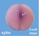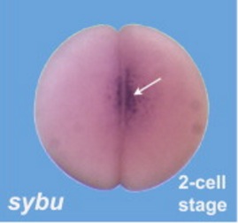 sybu (syntabulin) gene expression in Xenopus laevis embryo, NF stage2 (2-cell) , as assayed by in situ hybridization, vegetal view.