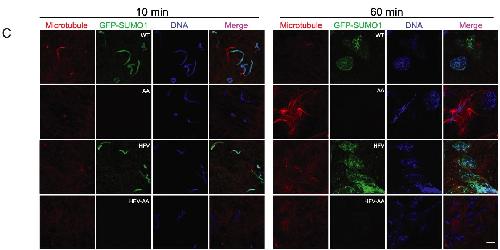 C, SUMO1 could be conjugated to sperm chromatin. Sperm chromatin isolated from male Xenopus was incubated with interphase Xenopus egg extracts and purified His-GFP-tagged SUMO1 mutant proteins. A strong GFP signal appeared on the chromatin in Xenopus egg extracts in less than 10 min and persisted even after the nuclear formation in WT and HFV groups. No GFP signal was observed on sperm chromatin with the AA or HFV-AA SUMO mutants. Microtubule structures formed by rhodamine-labeled tubulin indicate the cell cycle stage of Xenopus egg extracts. DAPI was used for DNA staining. Scale bar equals 10um