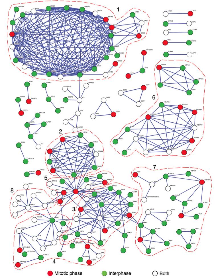FIG. 6. Functional protein interaction network analysis based on the STRING database. The image illustrates a network analysis of sumoylated proteins that was created with STRING. Proteins isolated from mitotic phase, interphase or both were highlighted in red, green or white, respectively. The protein complexes and pathways highlighted by red circle are involved in: (1) ribosome assembly and translation; (2) proteasomal degradation; (3) DNA replication and repair; (4) chromatin remodeling and transcriptional regulation; (5) cell cycle regulation; (6) the mitochondrial respiratory chain; (7) metabolic regulation; and (8) the sumoylation pathway.