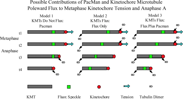 Figure 1. Three models based on different contributions of kinetochore motility and kinetochore microtubule flux to metaphase kinetochore tension and anaphase A. For each model, only a single kinetochore microtubule (KMT) is shown with the polar minus end (−) at the left and the plus end (+) attached to the kinetochore on the right. Arrows indicate sites of polymerization or depolymerization. Metaphase includes sequential times, t1 and t2; anaphase onset occurs at t2 and continues for sequential times t2, t3, and t4. At metaphase, the centromeric linkage between sister kinetochores and polar ejection forces on the arms support tension at kinetochores (large blue arrow). Tension is lost at anaphase onset when sisters separate and the polar ejection forces on the arms are inactivated (Funabiki and Murray, 2000). See text for details.