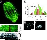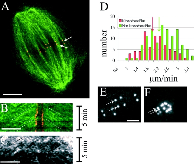 Figure 2. Confocal FSM of microtubule polymerization at metaphase kinetochores and centromere stretch. (A) Selected frame from a time-lapse movie showing the polymerization at kinetochores labeled with fluorescent CENP-A antibodies (red) and the poleward flux of kinetochore microtubule fluorescent speckles (green). The open arrow marks a kinetochore pair that was aligned for kymograph analysis (see Materials and methods); closed arrow marks a nonkinetochore fiber. (B) Kymograph of the kinetochore pair marked with open arrow in A. The kinetochores move relatively little with respect to each other while speckles on microtubules appear at the kinetochores and flux poleward. Flux velocity is proportional to the slope of the speckle trajectories away from the vertical direction in B. (C) Kymograph of nonkinetochore microtubules shows that speckles move poleward at similar rates in all microtubules. Note the gap of tubulin fluorescence between the sister kinetochores in B. There is no such gap for the interpolar bundles of microtubules (C). For the interpolar fibers, fluorescent speckle trajectories are seen toward both poles at most positions along the fiber, in contrast to kinetochore fibers, which exhibit trajectories primarily toward the pole faced by the kinetochore. D shows a histogram of flux velocities for kinetochore fibers (red) and for interpolar spindle fibers (green) obtained from the slopes of kymographs such as those in B and C. Note they have a similar distribution, with nonkinetochore flux being slightly faster. Colored arrows point to average values (see text). Image of sister kinetochores labeled with fluorescent CENP-A antibody in unfixed extracts at metaphase (E) or where spindles were disassembled with 10 μM nocodazole (F). Bars: A–C, 5 μm; E and F, 2 μm.