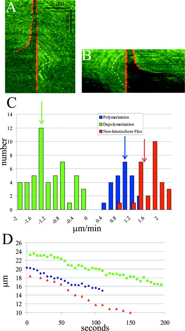 Figure 3. Confocal FSM of microtubule polymerization/ depolymerization at anaphase kinetochores. Time-lapse images were aligned so that a selected kinetochore was fixed in position relative to the rest of the spindle (see text). A and B are kymographs made from two different aligned spindles. Dotted white lines in each kymograph highlight speckle movements relative to the aligned kinetochores. In both examples, polymerization at the kinetochores slows as sisters begin to separate in anaphase (e.g., slopes of black lines in A become more vertical). When polymerization is slow enough, the kinetochore switches to depolymerization, where speckles are seen to move toward and disappear at the kinetochores. The kinetochore in A persists in depolymerization, whereas the kinetochore in B switches back to polymerization during the interval analyzed. (C) Histograms of velocities measured for polymerization and depolymerization at kinetochores and flux during anaphase. Arrows mark the average values. Depolymerization = 1.2 ± 0.6 μm/min (n = 27); polymerization = 0.9 ± 0.3 μm/min (n = 24 measurements); flux = 1.6 ± 0.4 μm/min (n = 27). We were unable to obtain values as chromosomes approached their poles because of the curvature of the kinetochore fibers. (D) Poleward movements of three kinetochores during the first two thirds of anaphase A. Notice that the kinetochores exhibit asynchronous periods of fast and slow movement. The average velocity over this period was 2.4 μm/min (n = 20 kinetochores from six spindles).