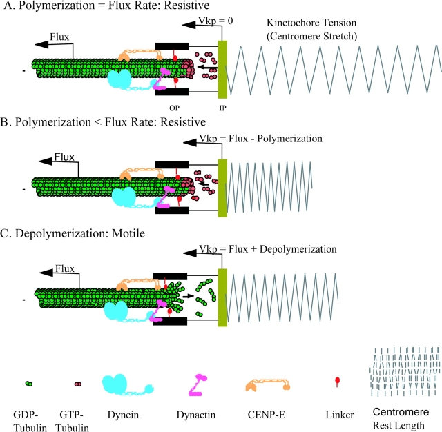 Figure 4. Updated models for the kinetochore–microtubule interface that include contributions from flux. Drawings in A–C are modified from Rieder and Salmon (1998). OP is a cross section of one microtubule attachment site in the outer plate of the kinetochore, and IP is a cross section of the inner plate. The stretch of the centromere beyond its rest length indicates the tension generated. Microtubule attachment and resistance to translocation through the attachment site may be provided by the microtubule motors CENP-E and cytoplasmic dynein, the nonmotor microtubule–binding domain of CENP-E, the microtubule binding domain of the p150 component of the dynactin complex bound to dynein, and unknown microtubule-binding proteins within the attachment site (see text for details).