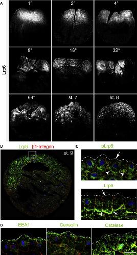 Figure S1, related to Figure 1. (C) Embryos were maternally depleted for Lrp6. Embryos were cryo-sectioned and stained for Lrp6 or pLrp6 (green) together with β1-integrin (red). Nuclei are marked in blue (Hoechst). Scale bar, 30μm. |