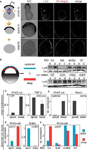(B) Dissected ectodermal layers from embryos injected with different reporter plasmids showed significantly higher activity of Wnt/β-catenin signaling and slightly higher activity of Wnt/PCP signaling in the deep cell layers. An Activin (TGF-β) reporter showed preferentially epithelial, albeit weak luciferase activity. For each bar, three pools of fifteen epithelial/deep layers were analyzed.