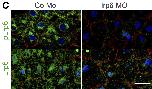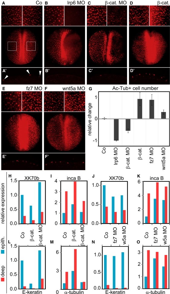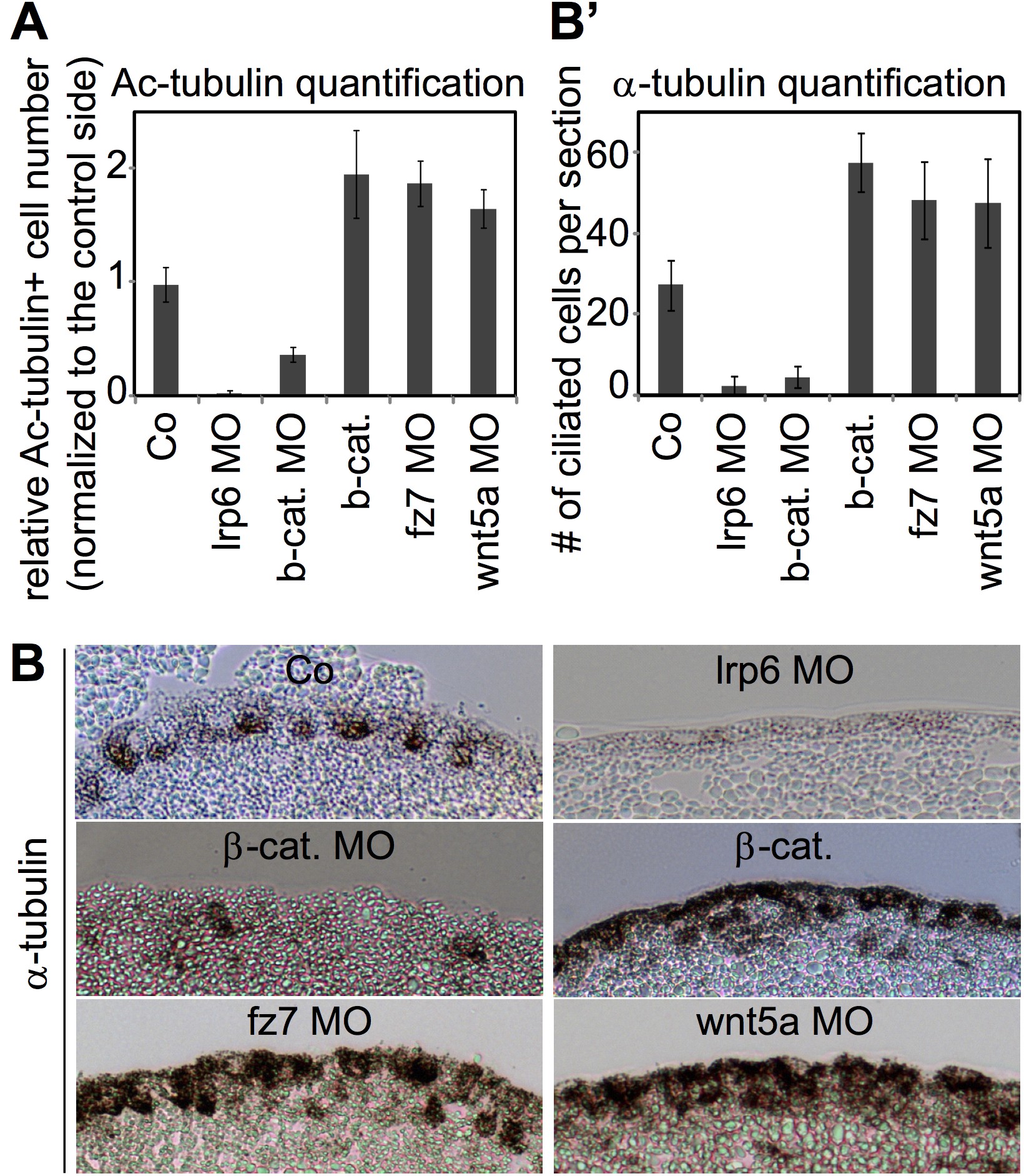 (A) quantification of Figure 4Aâ-Fâ showing relative Ac-tubulin positive cell number per embryo section. n>10 embryos per condition and >200 Ac- tubulin positive cells for each uninjected embryo side. Error bars, s. d. (B) α-tubulin in situ hybridization followed by cryo section in neurulae. (Bâ) quantification of (B). For each bar, n=10. |