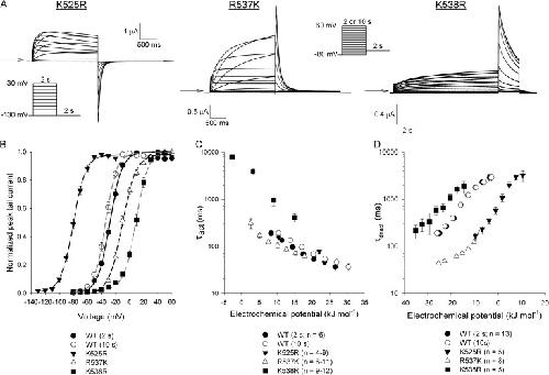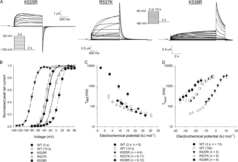 Figure 4. Charge-conserving mutations in S4 modulate hERG voltage-dependent gating. (A) Typical current traces recorded from S4 mutant channels in response to the voltage protocols shown (insets). Note the change in scale for K538R. Arrows indicate the zero current level. (B) Comparison of the mean G-V relationships for WT hERG and the mutant channels shown in A. Lines represent fits of the data to a Boltzmann function. n values and Boltzmann parameters are summarized in Table 1. (C) Plot of τact values for WT hERG and the S4 mutant channels against the electrochemical potential for activation. The envelope of tails protocol described in Fig. 3 A was used to measure τact values over a range of voltages that depended on the V1/2 of the G-V curve for each mutant. (D) Comparison of τdeact values for WT hERG and the S4 mutant channels. τdeact was measured using the deactivation protocol described in Fig. 3 B, with a variable voltage range to accommodate the different shifts in the G-V curves caused by each mutant. For B–D, data points represent mean ± SEM (error bars). Similar to Fig. 3, electrochemical potential energies for WT hERG calculated using ΔG0 values derived from G-V curves obtained using both 2- and 10-s pulse durations are presented.