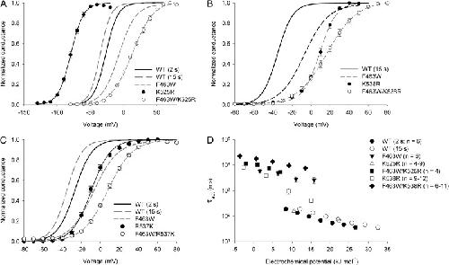 Figure 6. F463 may interact with K525 and K538 to modulate activation gating. (A) Comparison of the mean G-V relationship for the F463W/K525R double mutation with those of the single mutants. (B) Comparison of the mean G-V relationships for the F463W/K538R double mutation with those of the single mutants. (C) Comparison of the G-V relationships for the F463W/R537K double mutation with those of the single mutants. Lines in A–C represent Boltzmann function descriptions of the data; n values and Boltzmann parameters are shown in Table 1. (D) Plot of the τact values against the electrochemical potential for activation for the channel constructs described in A and B. Data points represent mean ± SEM (error bars).