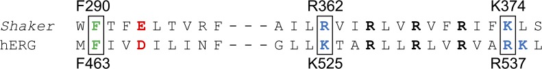 Figure 1. Highly conserved amino acids in the S2 and S4 segments. Sequence alignment of the S2 region (left) and the S4 voltage sensor (right) of Shaker and hERG channels. Conserved residues forming the putative gating charge transfer center in S2 are highlighted in green. The positive S4 residues investigated in this study are highlighted in blue. The remaining S4 charges are shown in bold font. The conserved negative residues in S2 suggested to contribute to the gating charge transfer center in Shaker channels (i.e., E293) are shown in red.