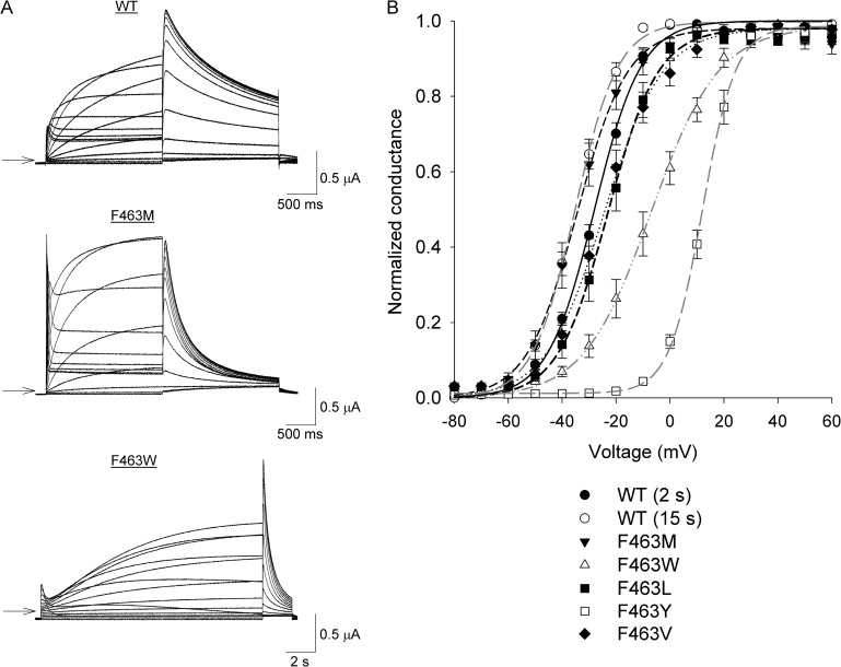 Figure 2. Bulky, aromatic substitutions of hERG F463 alter voltage-dependent gating. (A) Typical current traces recorded from WT and mutant hERG channels. Oocytes were held at −80 mV and subjected to either 2- or 15-s depolarizing steps to +60 V in 10-mV increments. Tail currents were recorded during a 2-s pulse to −60 mV. Arrows indicate the zero current level. Note the change in scale for F463W. (B) Effects of the F463 mutations on the G-V relationship. Peak tail currents from experiments such as those in A were normalized to the maximum peak tail current to provide a measure of conductance. WT data recorded using both 2- and 15-s pulses are shown to allow for comparisons with mutant G-V curves obtained using different pulse durations. Data points represent means ± SEM (error bars). Solid and broken lines indicate fits of the data to a Boltzmann function (see Materials and methods). n values and parameters from the Boltzmann fits are summarized in Table 1.