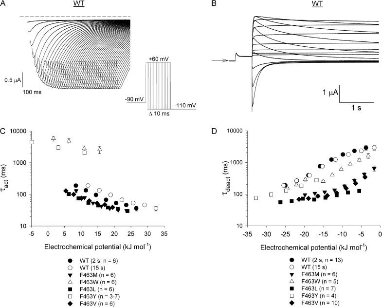 Figure 3. The F463W and F463Y mutations dramatically slow channel activation. (A) Typical WT hERG currents recorded during an envelope of tails voltage protocol (inset). For clarity, capacity transients have been removed and current traces truncated such that only the tail currents are shown. The broken line represents the zero current level. To measure τact, peak tail current amplitudes were plotted against time and fit to a single exponential function. (B) Representative currents recorded from WT hERG channels during a deactivation protocol. Oocytes were held at −80 mV, depolarized to +60 mV for 500 ms to activate the channels, and then repolarized to potentials between −110 and +60 mV for 4 s. Tail currents were fit to a double exponential function and the value for τdeact was calculated as a weighted mean of the fast and slow time constants for the current decay. (C and D) Plot of τact (C) and τdeact (D) values for WT hERG and F463 mutant channels against the electrochemical potential for channel activation and deactivation, respectively (see Materials and methods). Because slower activating channels (e.g., F463W) were recorded using 15-s pulse durations, WT hERG data were plotted twice, using electrochemical potential energies calculated with ΔG0 values derived from G-V curves obtained using both 2- and 15-s pulse durations.