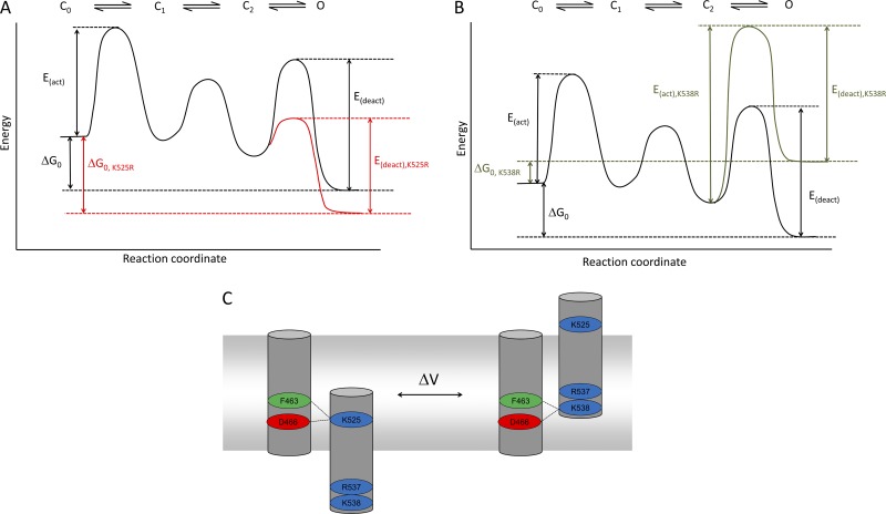 Figure 8. Schematic representation of hERG channel gating. (A) Reaction coordinate diagram for hERG gating, based on the linear gating scheme proposed by Wang et al. (1997). Activation involves transitions through three closed (C) states to a single open (O) state; the inactivated state has been omitted for simplicity. The black line represents the gating reaction for WT channels; the red line highlights possible changes caused by the K525R mutation. These include a more negative value for ΔG0 consistent with stabilization of the O state and a decrease in the energy barrier (E(deact)) for the O → C2 transition to allow for faster deactivation. (B) The same reaction coordinate diagram in A is used to highlight the possible changes to the gating reaction caused by the K538R mutation (green line). These include a positive value for ΔG0 consistent with stabilization of the closed state and a large increase in the energy barriers for transitions between the C2 and O states that allows for the increases in the values of τact and τdeact. (C) Schematic showing the proposed functional interactions between the S4 gating charges and F463 and D466 in the S2 segment. Broken lines illustrate the interaction pairs thought to occur in the resting state (left) and the activated state (right).