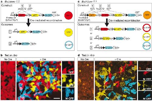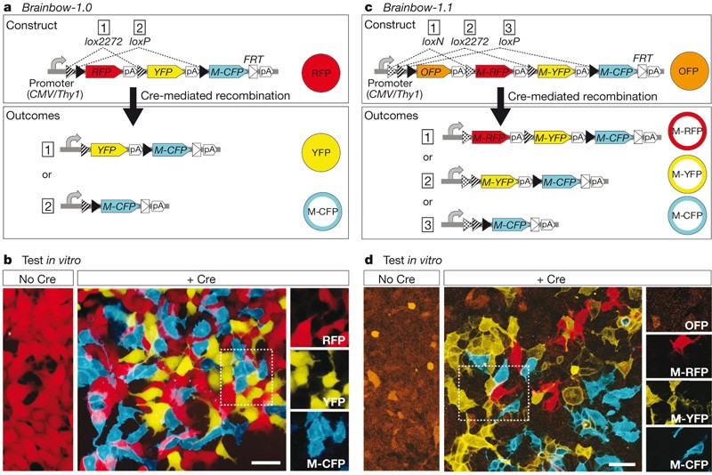 Figure 1: Brainbow-1: stochastic recombination using incompatible lox variants. a, In Brainbow-1.0, incompatible sets of lox sites alternate: Cre chooses between excision events 1 or 2. Before Cre action, only the gene following the promoter is expressed (RFP). Recombination switches expression to either YFP (1) or M-CFP (2). b, HEK cells stably transfected with CMV-Brainbow-1.0 express RFP. On transient transfection with Cre, these cells randomly switch to YFP or M-CFP expression. c, In Brainbow-1.1, a third set of incompatible lox sites (loxN) is added, creating three recombination possibilities (1, 2 or 3), switching OFP expression to RFP, YFP or CFP expression. d, Cells stably transfected with Brainbow-1.1 express OFP. Cre recombination leads to expression of M-RFP, M-YFP or M-CFP. pA, polyadenylation signal; M-XFP, membrane-tethered XFP. FRT site allows reduction of transgene arrays (Fig. 4d). Scale bar, 50 mum.
