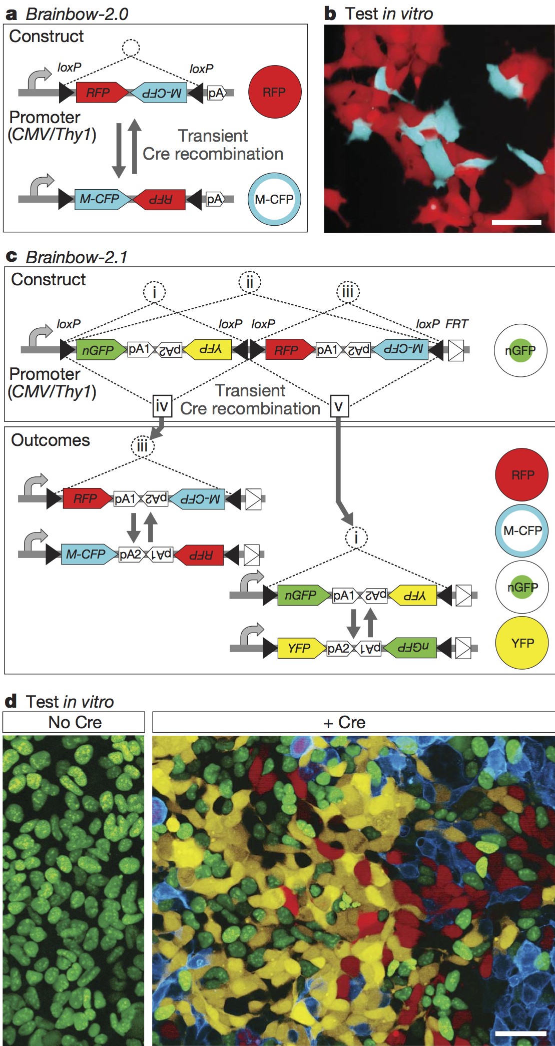 Figure 2: Brainbow-2: stochastic recombination using Cre-mediated inversion. a, In Brainbow-2.0, Cre triggers inversion of a DNA segment flanked by loxP sites in opposite orientation. In 50% of cells, inversion should end in an antisense orientation and switch gene expression. b, HEK cells stably expressing CMV-Brainbow-2.0 produce RFP, and stochastically switch to CFP expression when transfected with Cre. c, The Brainbow-2.1 construct contains two tandem invertible DNA segments. Inversion (i–iii) and excision (iv, v) recombination events create four expression possibilities. d, Stable CMV-Brainbow-2.1 transfectants express nuclear GFP (nGFP). Cre recombination triggers expression of YFP, RFP or M-CFP. pA1 and pA2, SV40 and bGH polyadenylation signals. Scale bars, 50 μm.