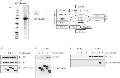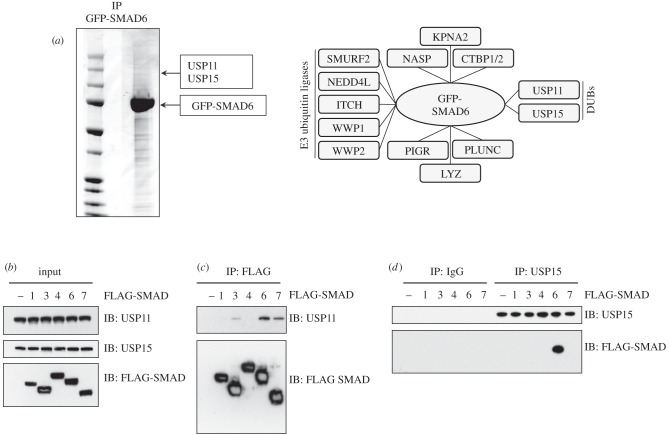 Figure 1. Identification and characterization of USP15 as an interactor of SMAD6. (a) Coomassie stained gel image showing anti-GFP-IPs from HEK293 extracts expressing GFP-SMAD6. The interacting proteins were excised as 2 mm gel pieces, digested with trypsin and identified by mass spectrometry. The location where USP11 and USP15 were identified is indicated. All protein interactors of GFP-SMAD6 identified by mass spectrometry are indicated in the right panel. Protein interactors of GFP control were removed from the list of GFP-SMAD6 interactors. (b) HEK293 cells were transfected transiently with FLAG-SMADs. Extract inputs were resolved by SDS-PAGE and subjected to immunoblotting (IB) with anti-USP11, anti-USP15 and anti-FLAG antibodies as indicated. (c) FLAG-IPs were subjected to immunoblotting with anti-USP11 and anti-FLAG antibodies. (d) Endogenous pre-immune IgG or anti-USP15 IPs were subjected to immunoblotting with anti-FLAG and anti-USP15 antibodies as indicated.