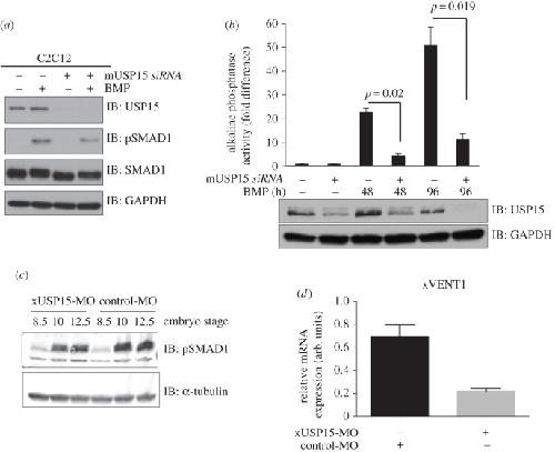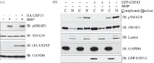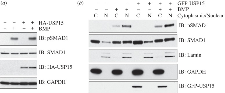Figure 3. USP15 augments BMP signalling. (a) HEK293 cells transiently expressing control HA-vector or HA-USP15 were serum-starved overnight and stimulated with 6.25 ng ml−1 BMP-2 for 1 h prior to lysis. Extracts were resolved by SDS-PAGE and subjected to immunoblotting with antibodies against HA, endogenous pSMAD1, total SMAD1 and GAPDH. (b) HEK293 cells stably expressing GFP or GFP-USP15 were serum-starved overnight and stimulated with 6.25 ng ml−1 BMP for 1 h prior to separation into cytoplasmic and nuclear fractions. The fractions were resolved by SDS-PAGE and subjected to immunoblotting with antibodies against GFP, Lamin A/C, GAPDH, endogenous pSMAD1 and total SMAD1.
