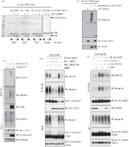 Figure 5. USP15 deubiquitylates ALK3. (a) Human recombinant GST-USP15 expressed in Escherichia coli was employed in an in vitro deubiquitylation assay using K48-, K63- and K11-linked and linear di-ubiquitin (Ub) molecules as substrates. The reactions were quenched by adding SDS sample buffer and boiling for 5 min. The samples were resolved by SDS-PAGE, Coomassie stained and then imaged. (b) HEK293 cell transfected with FLAG control or FLAG-ALK3 vectors were treated with bortezomib (10 μM) for 3 h prior to lysis. FLAG-IPs from extracts (1 mg protein) were used as substrates for GST-USP15 in an in vitro deubiquitylation assay. The reactions were stopped by adding SDS sample buffer and boiling for 5 min. The samples were resolved by SDS-PAGE and subjected to immunoblotting analysis using the indicated antibodies. (c) HEK293 cells were transiently transfected with FLAG control or FLAG-ALK3 vectors with or without HA-USP15. Prior to lysis, cells were treated with 10 μM bortezomib for 3 h. FLAG-IPs and extract inputs were resolved by SDS-PAGE and subjected to immunoblotting analysis using the indicated antibodies. (d) HEK293 cells transiently expressing FLAG-ALK3, HA-USP15 and USP15 C269S DUB dead mutant (DD) were serum-starved overnight, pretreated with 10 μM bortezomib for 3 h then stimulated with 6.25 ng ml–1 BMP for 1 h prior to lysis. FLAG-IPs and extract inputs were resolved by SDS-PAGE and subjected to immunoblotting with the indicated antibodies. (e) HEK293 cells transiently expressing siUSP15-3, FLAG-ALK3 and siUSP15-3 resistant silent mutant of HA-USP15 (HA-USP15R) were serum-starved overnight, pretreated with 10 μM bortezomib for 3 h then stimulated with 6.25 ng ml−1 BMP for 1 h prior to lysis. FLAG-IPs and extract inputs were resolved by SDS-PAGE and subjected to immunoblotting with the indicated antibodies.